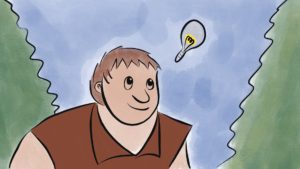 Toen sprong hij overeind. Hij kon hier niet langer onder de bomen blijven zitten. Hij moest wat doen! En opeens wist hij ook wat hem te doen stond: hij moest een huis bouwen. Met een lampje. Voor zichzelf! Net zoals de mensen.