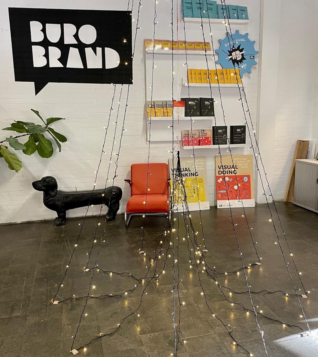 Dat hondje ben ik het afgelopen half jaar gaan uitlaten; ik ging een deel van mijn tijd interim werken: bij Buro BRAND. Een bedrijf in creatieve en visuele communicatie. Denk aan getekende notulen, een kekke praatplaat, of een visueel jaarverslag. En ze geven volop trainingen in zakelijk tekenen.
