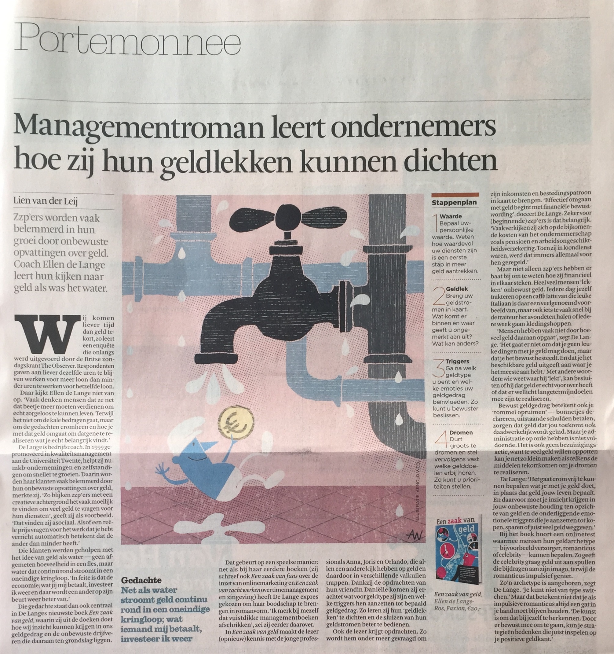 “De gedachte dat geld rondstroomt als water staat centraal in De Lange’s nieuwe boek ‘Een zaak van geld’, waarin zij uit de doeken doet hoe wij inzicht kunnen krijgen in ons geldgedrag en de onbewuste drijfveren die daaraan ten grondslag liggen. Dat gebeurt op een speelse manier, net zoals bij haar eerdere boeken.”