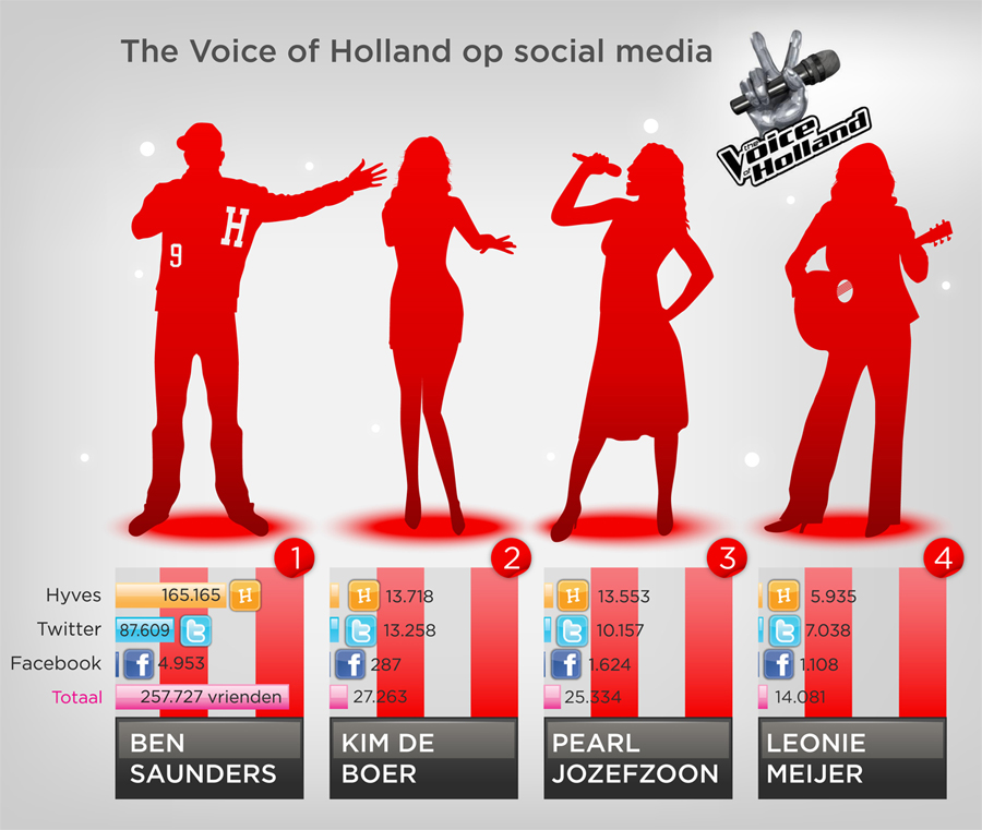 Of jouw nieuwe produkt of dienst de winnaar wordt, kun je vooraf al weten. Niet door te bekijken of jouw produkt technisch superieur is en voorop loopt. Wel door goed te analyseren hoeveel fans je hebt en hoe er over je gepraat wordt op sociale media. In The Voice of Holland zijn de sociale media dan ook bewust ingezet om de hype rond het programma te vergroten.