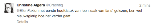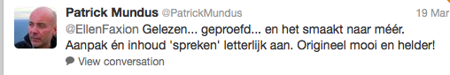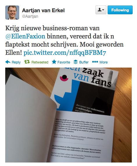 Ik moet bekennen dat ik met de nodige scepsis aan ‘Een zaak van fans’ begon. Als romanschrijfster en schrijfdocente zou ik mijn kromme tenen maar moeten vergeten en gaan voor de inhoud. Want die leek me interessant. Ellen de Lange-Ros heeft al mijn vooroordelen met haar boek van tafel geveegd: vlot en leesbaar geschreven. Voorzien van cliffhangers, zodat je na ieder hoofdstuk door wilt lezen. Dat is dé manier om een lezer door het verhaal heen te trekken. Ellen heeft niet alleen een unieke vorm gevonden voor lastige materie, maar die vorm ook nog eens goed uitgevoerd. Chapeau! Een zaak van fans geeft een heldere kijk op marketing in een verleidelijke vorm.