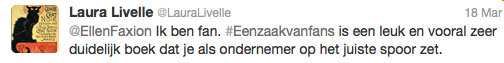 Met “Een zaak van fans” heeft Ellen de Lange zich geplaatst in de traditie van Ken Blanchard & Jos Burgers (Hondenbrokken). Een business-roman die niet alleen leerzaam is maar ook spannend. De vorm zorgt ervoor dat het lekker wegleest en dat het je nieuwsgierig maakt. Je wil weten hoe het Anna, Joris & Orlando zal vergaan. In de tussentijd leer je hoe je met fans om moet gaan en welke rol ze kunnen spelen voor je bedrijf. De lessen van popzanger David zijn relevant voor iedereen die op zoek is naar meer zakelijk succes. Waardevolle lessen voor ZZP’ers, MKB ondernemers en grote bedrijven. Wil je met een paar uur lekker lezen je werk leuker en je zaak succesvoller maken? Dat is dit boek je op het lijf geschreven!