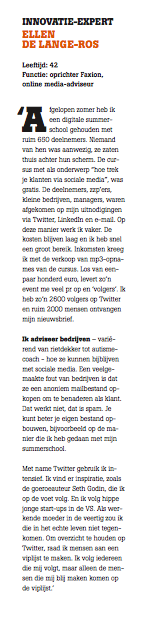 In Intermediair van 28 april 2016 stond een artikel over nieuwe vaardigheden en functienamen van de toekomst, bij het toenemend belang van online media. In het artikel werd ik geïnterviewd als social media-expert, naast e-marketingspecialist Cor Molenaar en professor Ed Peelen, bijzonder hoogleraar Content Marketing aan de UvA.